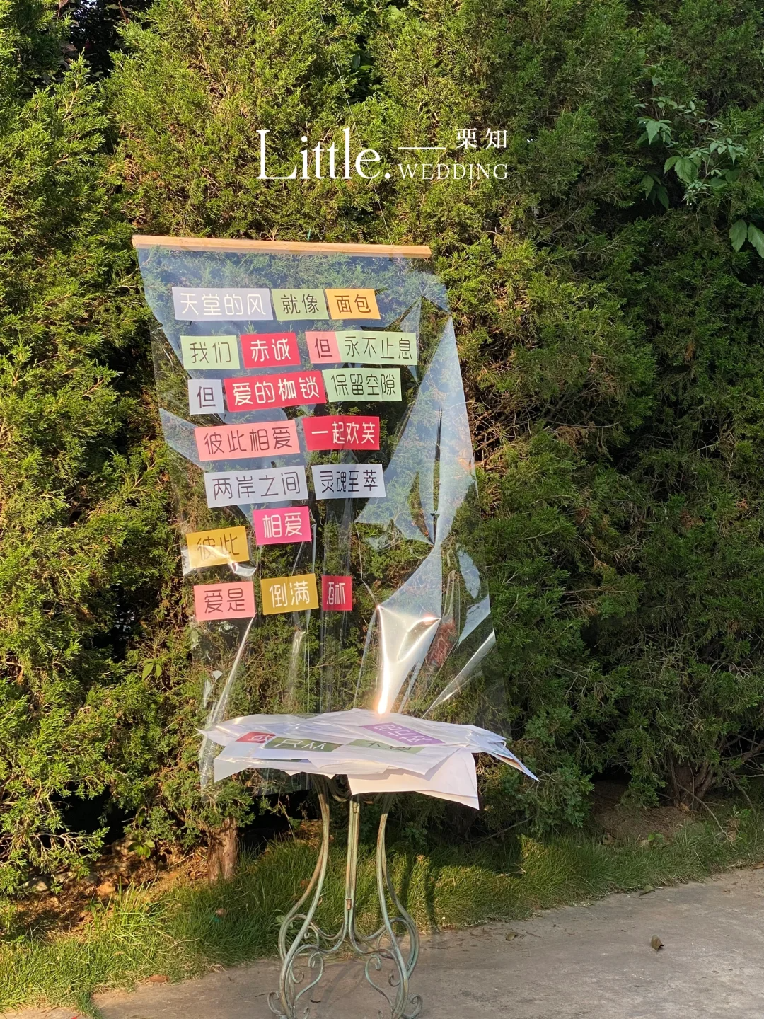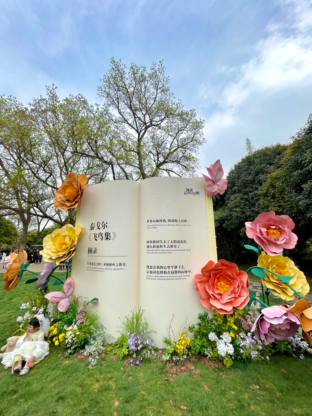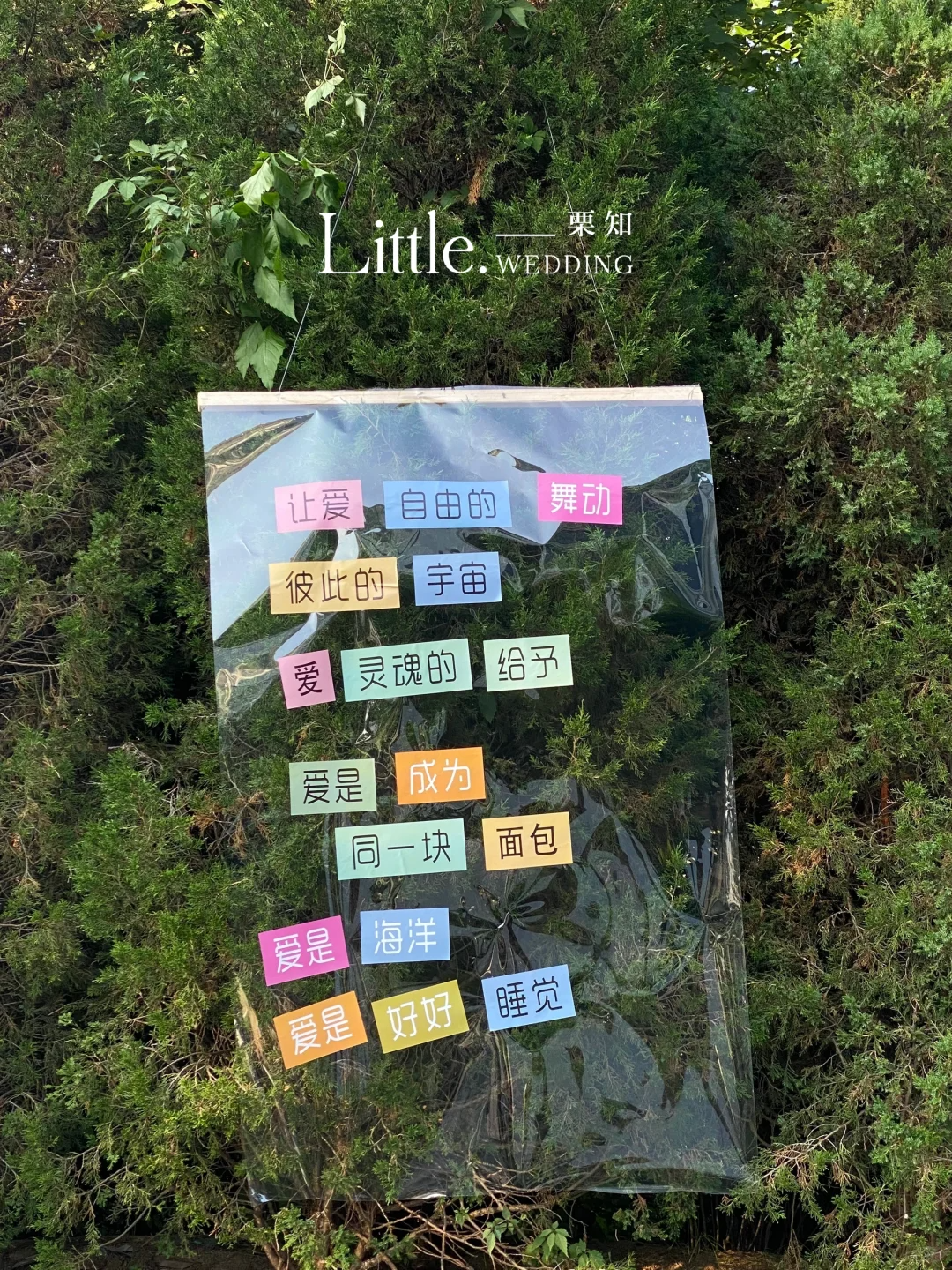 更有诗意玩法 —— 春日拼诗会,让大家在树上写诗/在花上写诗,准备一幅透明的挂布,将它挂在发芽的树木上或者盛放的花枝间,再用打印好的词组成一首春天的拼接诗,像下面这样:
