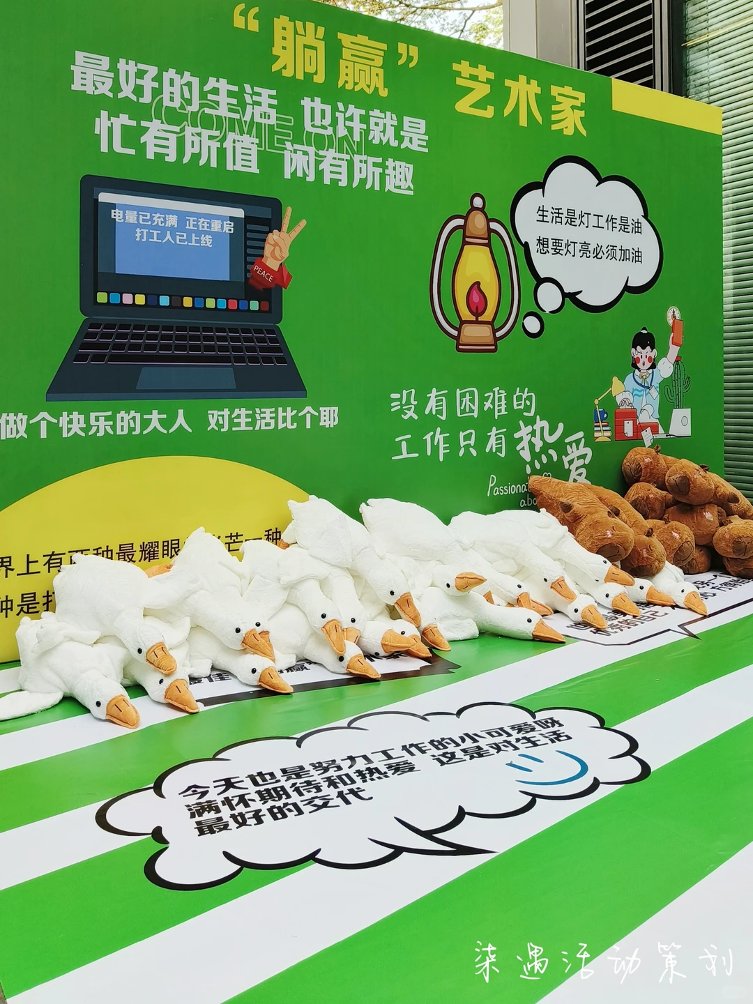 把那些年背过的“锅”、做过的“梦”、担过的“责任……统统放到背景墙上供大家打卡,员工还可以把觉得有意思的或者喜欢的文案背在身上拍照。