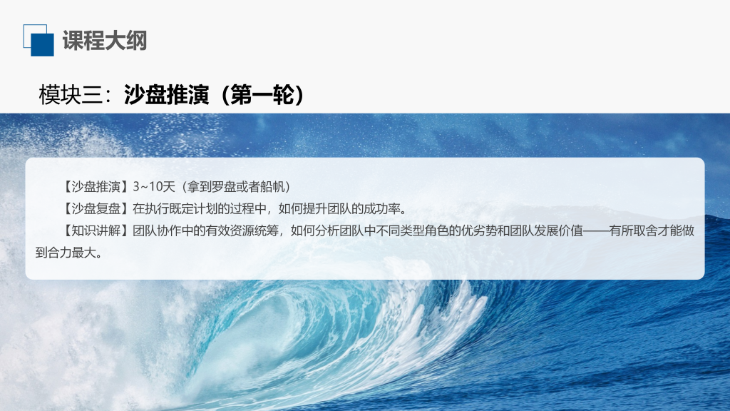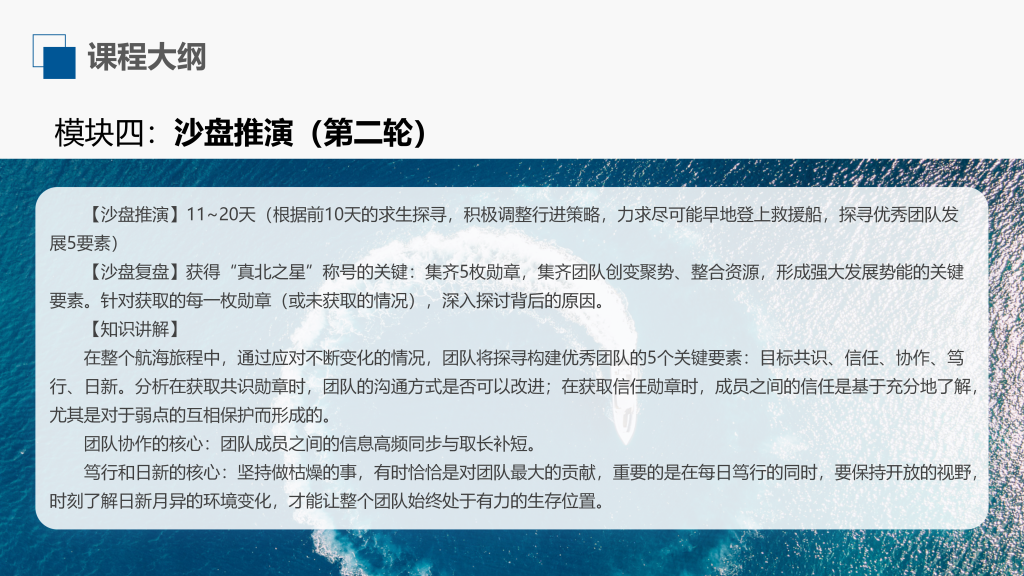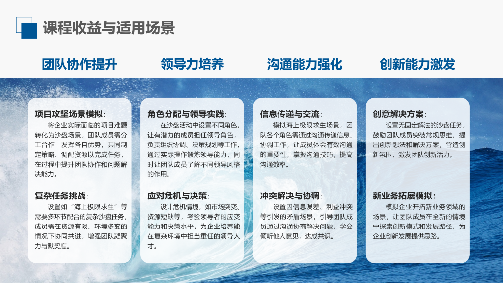 通过《沙漠掘金》模拟体验,针对团队成员在实现目标时可能出现的各类问题,进行深度挖掘并找到解决方法。让参训学员不仅理解团队成员在共同目标下如何进行职责分工、决策、计划、资源配置、协作沟通,还掌握了团队协作的思路、方法和技巧。
